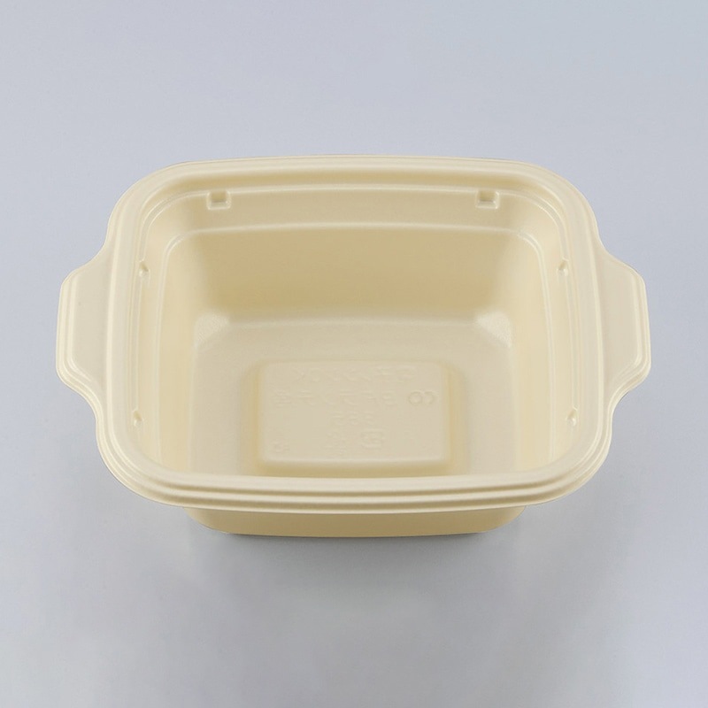 取っ手のついた角型の愛らしいフォルムで、出来立ての温もりを印象付けます。別売の内嵌合蓋は、ボリューム感を訴求するメニューに適した高さのある「BFランチ角385内嵌合蓋」と、落とし込んだ蓋形状でコンパクトでつまり感のある見た目になる「BFランチ角385TC内嵌合蓋U字穴」からお選びいただけます。●電子レンジ使用可●耐熱温度:105℃●ごはんの量:通常蓋約490g/TC蓋約350g