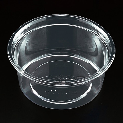 少量目の惣菜サラダカップ。回収された透明容器やPETボトルをリサイクルした原料を使用し、CO2の排出を抑えた環境負荷の少ない商品です。お惣菜・サラダ・フルーツなどに適しています。