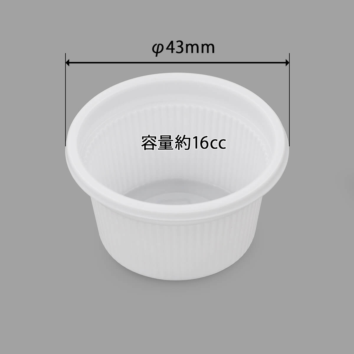 ソース・ドレッシング容器として。試飲、試食などにも! テイクアウトに最適!ソース・ドレッシングなどのポーションカップ! ●寸法/約直径43×高さ23mm●質量/約0.8g●容量/約16ml●色/ホワイト●材質/HIPS●耐熱温度/約90℃●生産国/日本製●電子レンジ使用不可●フタは別売りです