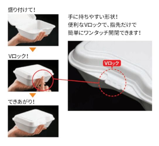 蓋がワンタッチで閉まる発泡タイプのランチBOX!ケータリングやランチボックスにおすすめの食品容器です。●電子レンジ使用不可●オーブン使用不可●耐油性:なし●耐熱温度:85℃●ごはんの容量:約200g