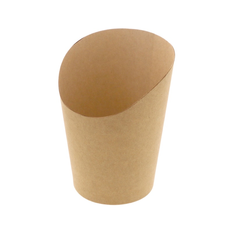 片手で持ちやすく、内側PE加工で油染みしにくいクラフト紙容器。ポテトフライやから揚げなど、ホットスナックを入れるのにぴったりな斜めカットの形状です。