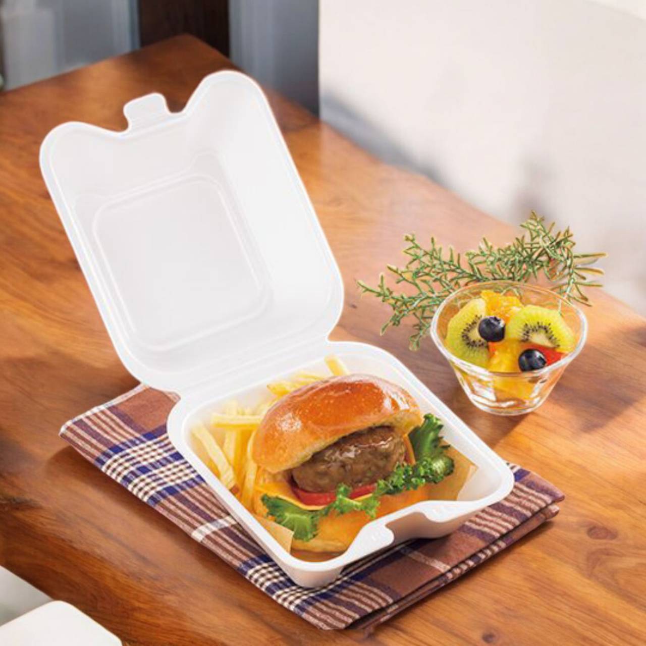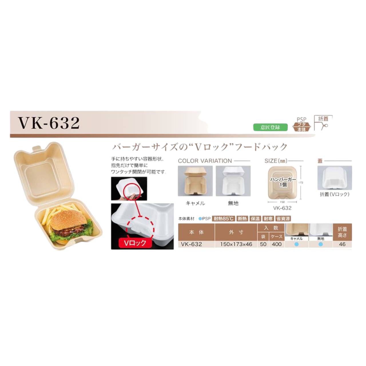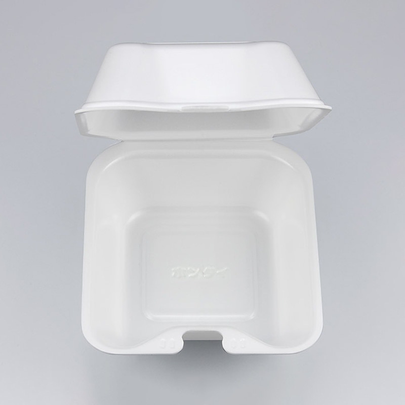 蓋がワンタッチで閉まるバーガーサイズのVロックフードパックです。高さのある折蓋と深さのある本体で、ハンバーガーのボリューム感にしっかり対応します。底面の「ホンタイ」刻印で、盛付け作業をアシストします。●電子レンジ使用不可●オーブン使用不可●耐熱温度:85℃