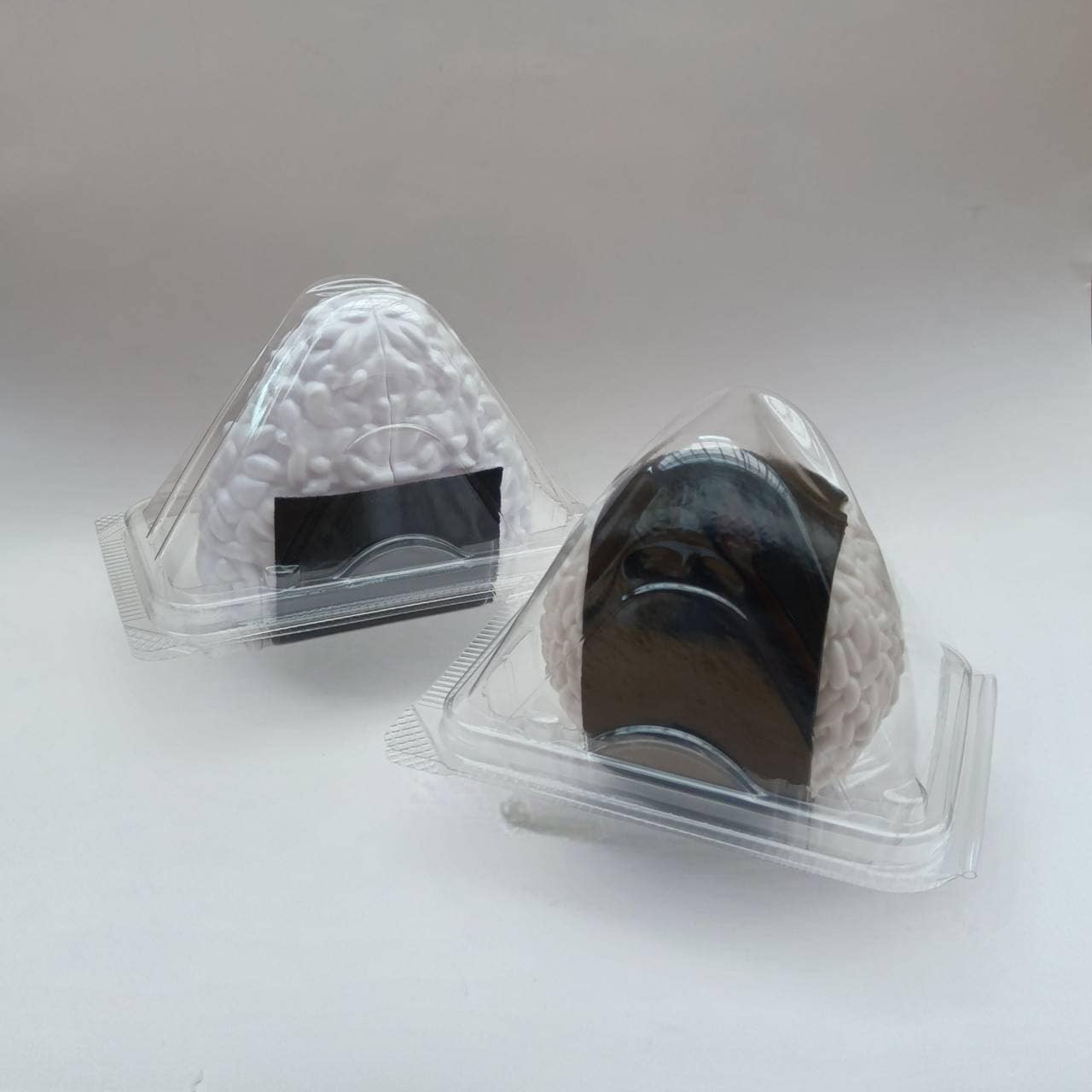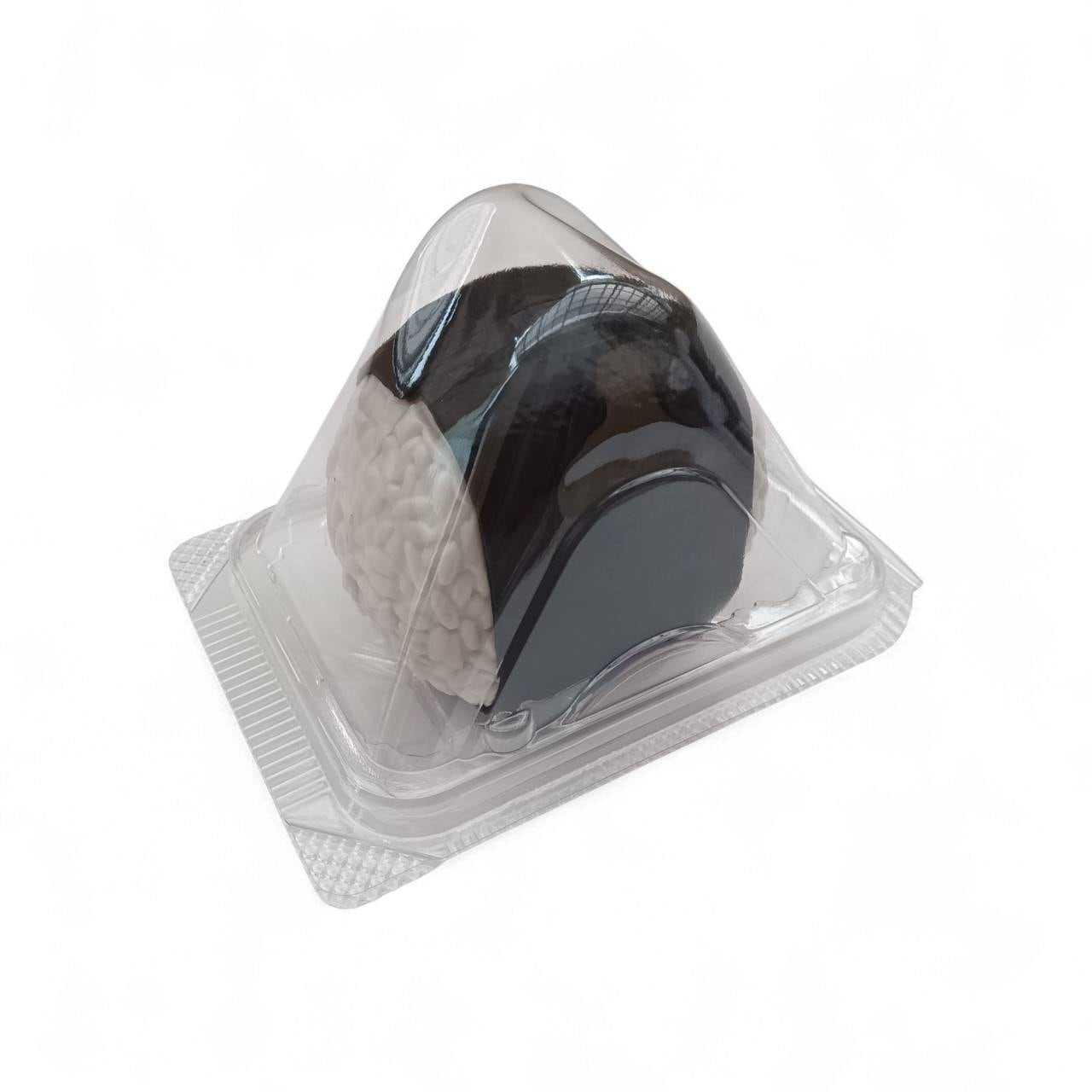 新設計のおにぎり型容器です。 この容器は、忙しいオフィスや移動中でも手を汚さずに片手で持って食べられるように設計されています。