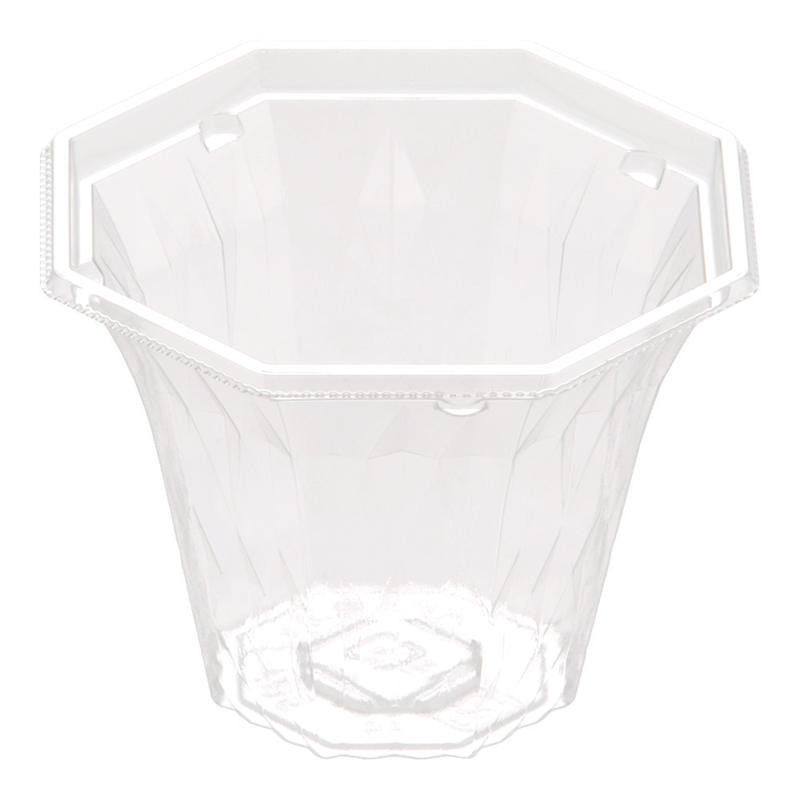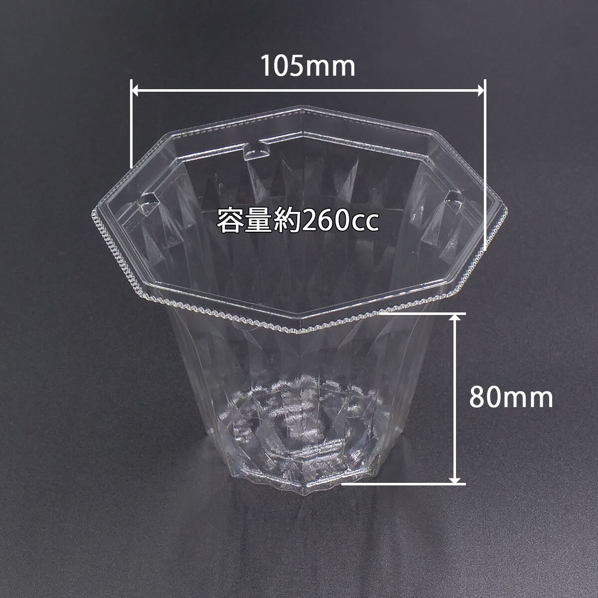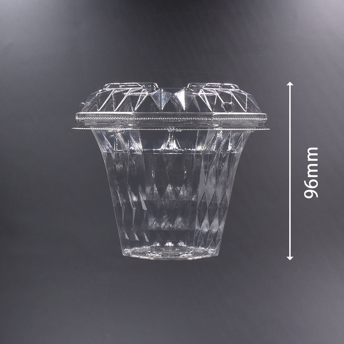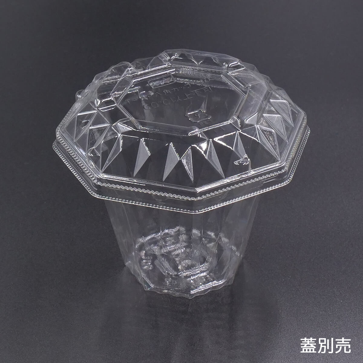 カップ型透明容器。側面がダイヤカットの深型タイプです。サラダやカットフルーツなどに。回収された透明容器やPETボトルをリサイクルした原料を使用。CO2の排出を抑えた環境負荷の少ない商品です。外嵌合蓋は別売です。●電子レンジ使用不可●耐熱温度:60℃●容量:260CC